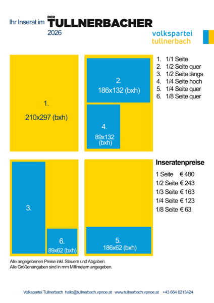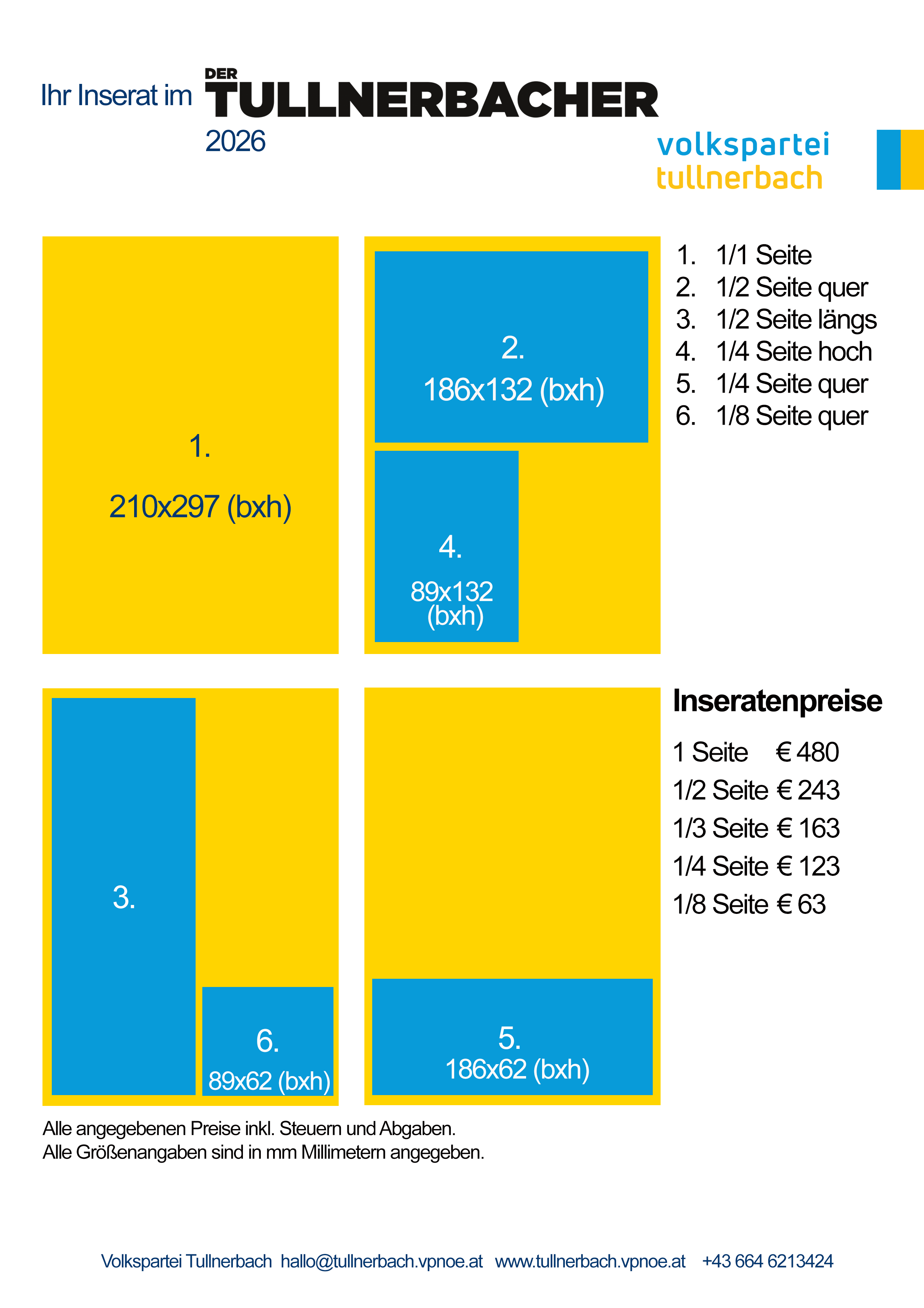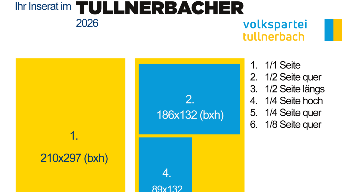 Gerne stellen wir Ihnen für Ihre Ankündigungen und Inserate einen Teil einer Seite - oder auch eine ganze - im Tullnerbacher zur Verfügung! Unser Inseratenspiegel (HIER klicken) informiert über Preise und Größen für 2026. Wir freuen uns auf Ihre Anfrage!